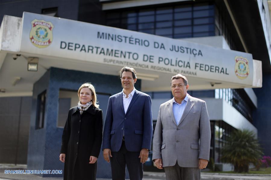 CURITIBA, agosto 20, 2018 (Xinhua) -- El candidato vicepresidencial del Partido de los Trabajadores (PT), Fernando Haddad (c), la presidenta nacional del PT, Gleisi Hoffman (i), y el tesorero nacional del PT, Emídio de Souza (d), posan después de visitar al ex presidente brasile?o, Luiz Inácio Lula da Silva, en la Superintendencia de la Policía Federal, en Curitiba, estado de Paraná, Brasil, el 20 de agosto de 2018. El ex presidente brasile?o, Luiz Inácio Lula da Silva, del Partido de los Trabajadores (PT), lidera las preferencias electorales rumbo a los comicios presidenciales de octubre próximo con un 37.3 por ciento de las intenciones de voto, según un sondeo publicado el lunes. (Xinhua/RODOLFO BUHRER/FOTOARENA/ESTAD?O CONTEúDO/AGENCIA ESTADO)
