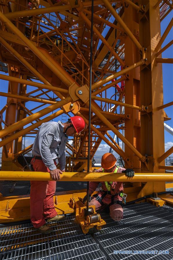 Trabajadores laboran en una torre gigante de suministro de energía en construcción en la isla Cezi de Zhoushan, provincia de Zhejiang, en el este de China, el 28 de agosto de 2018. A una impresionante altura de 380 metros, las dos torres llevarán los cables de alimentación entre las islas Jintang y Cezi de Zhoushan, recorriendo una distancia de 2,656 metros. El nuevo proyecto de las torres es una parte de un nuevo proyecto de línea de energía de ultra alta tensión entre las ciudades de Zhoushan y Ningbo, que está programado que sea terminado para finales de octubre. (Xinhua/Xu Yu)