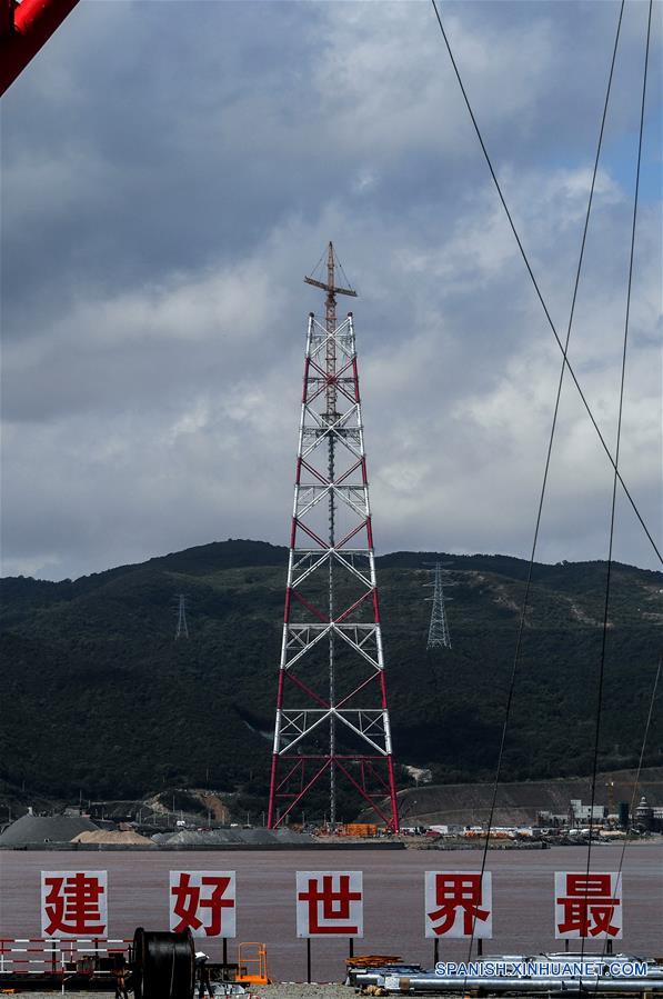 Vista de una torre gigante de suministro de energía en construcción en la isla Jintang de Zhoushan, provincia de Zhejiang, en el este de China, el 28 de agosto de 2018. A una impresionante altura de 380 metros, las dos torres llevarán los cables de alimentación entre las islas Jintang y Cezi de Zhoushan, recorriendo una distancia de 2,656 metros. El nuevo proyecto de las torres es una parte de un nuevo proyecto de línea de energía de ultra alta tensión entre las ciudades de Zhoushan y Ningbo, que está programado que sea terminado para finales de octubre. (Xinhua/Xu Yu)
