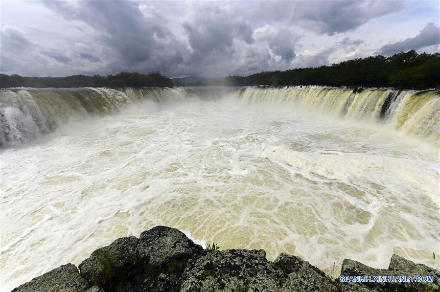 Vista de la Cascada Diaoshuilou en el área escénica del lago Jingpo, en Mudanjiang, provincia de Heilongjiang, en el noreste de China, el 28 de agosto de 2018. El espléndido paisaje de la Cascada Diaoshuilou atrae a muchos turistas. (Xinhua/Zhang Chunxiang)
