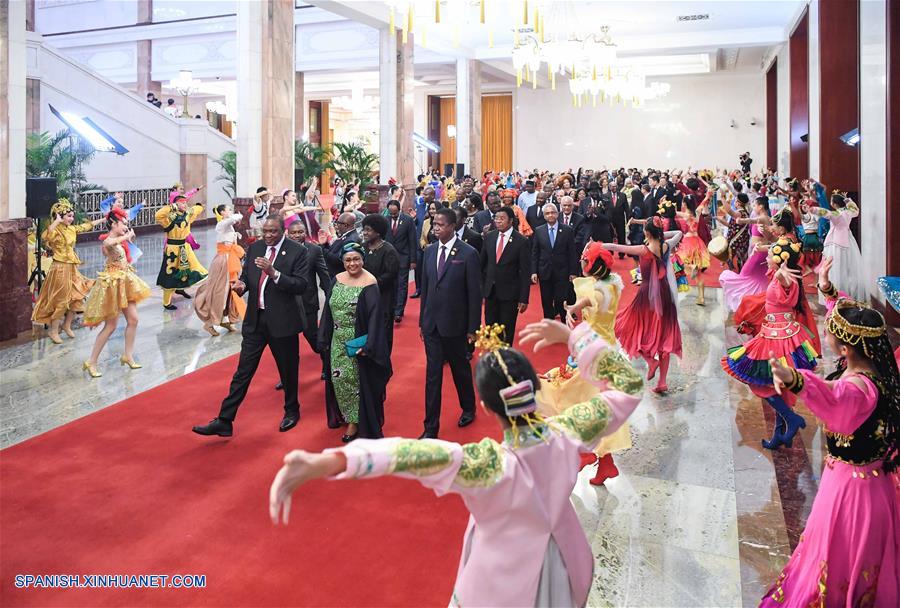 BEIJING, septiembre 3, 2018 (Xinhua) -- Líderes extranjeros y sus cónyuges que asisten a la Cumbre de Beijing 2018 del Foro de Cooperación China-Africa (FOCAC, por sus siglas en inglés) son recibidos por jóvenes artistas en su camino al banquete de bienvenida ofrecido por el presidente de China, Xi Jinping y su esposa Peng Liyuan en el Gran Palacio del Pueblo en Beijing, capital de China, el 3 de septiembre de 2018. (Xinhua/Shen Hong)