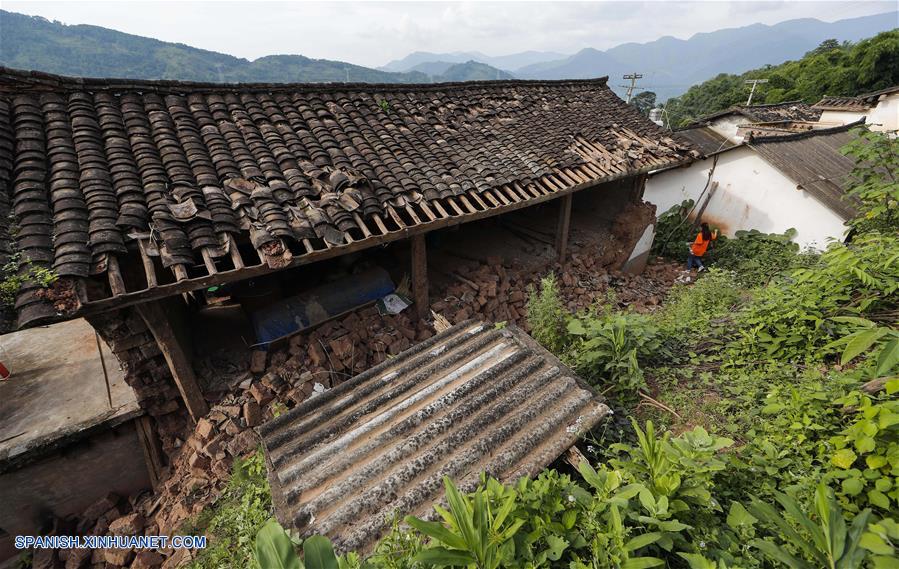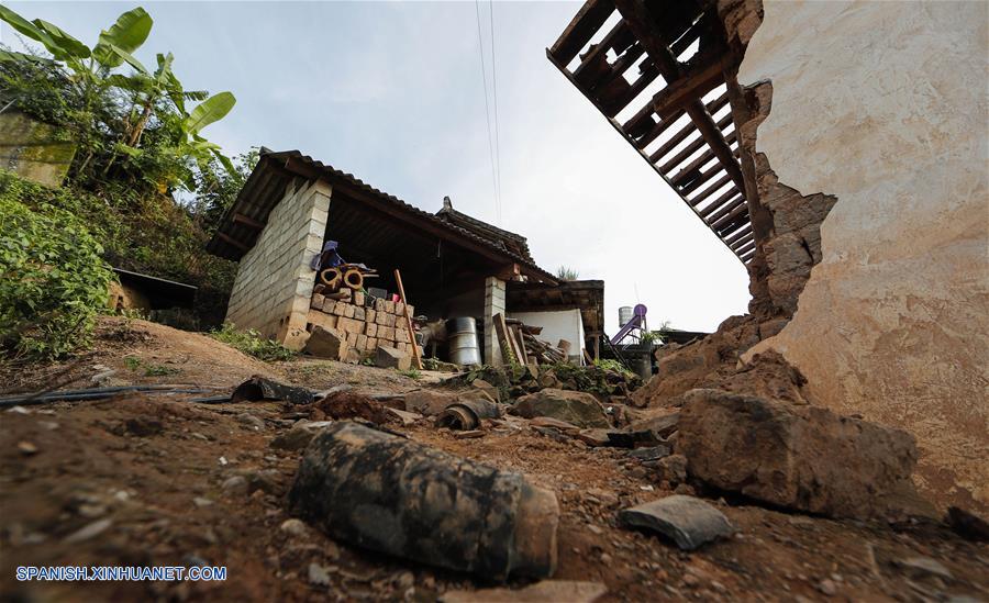 YUNNAN, septiembre 8, 2018 (Xinhua) -- Vista de una vivienda da?ada en el municipio de Tongguan del Condado Autónomo Hani de Mojiang, provincia de Yunnan, en el suroeste de China, el 8 de septiembre de 2018. Catorce personas sufrieron heridas leves como consecuencia de un sismo que sacudió el distrito autónomo de la etnia hani de Mojiang en la provincia suroccidental china de Yunnan, a las 10:31 del sábado (hora de Beijing), informaron las autoridades locales. Equipos profesionales de rescate equipados con sensores para ubicar persanas sepultadas, cámaras térmicas y excavadoras, así como perros rastreadores, también fueron enviados a la zona afectada. (Xinhua/Zhou Lei)
