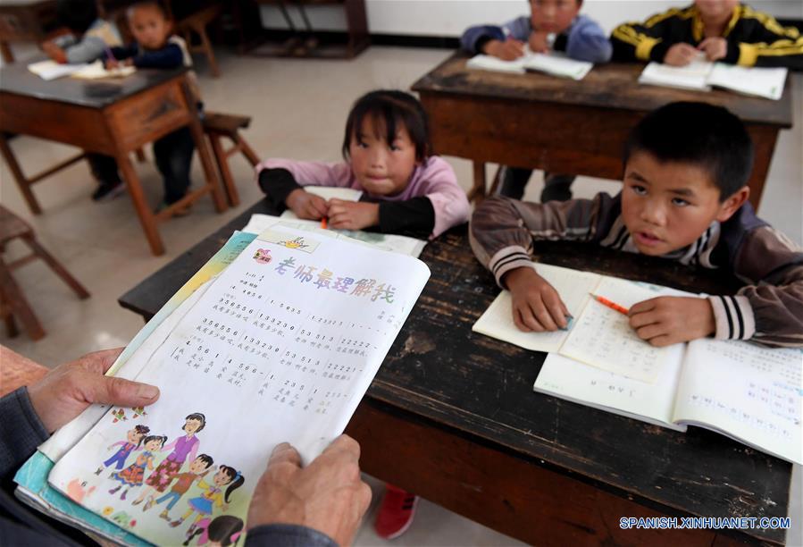 Imagen del 5 de septiembre de 2018 de estudiantes aprendiendo música bajo las instrucciones de Wang Zhengxiang en la Escuela Primaria Ayiyang, en la villa de Sanmeng del Condado Autónomo Yi y Miao de Luquan, provincia de Yunnan, en el suroeste de China. Un maestro, ocho alumnos, ninguno fue y será abandonado gracias al maestro rural Wang Zhengxiang. Wang, del grupo étnico Miao, de 56 a?os de edad, es el único maestro y ha estado ense?ando en la remota escuela rural de Ayiyang durante 38 a?os. La Escuela Primaria Ayiyang, situada a una altitud de 2,600 metros sobre el nivel de mar y rodeada de monta?as, no está al alcance de la mano del mundo exterior. Hay sólo ocho estudiantes en la escuela. Sin embargo, Wang se ocupa de sus alumnos con amor, consideración y un fuerte sentido de la responsabilidad. El compra zapatos y artículos de uso diario para los estudiantes afectados por la pobreza con su propio dinero y ha tratado por todos los medios de mantener a aquellos que quieren abandonar debido a la insuficiencia económica. "Soy el único profesor en el pueblo. Y mientras haya un estudiante, ense?aré con tanto esfuerzo como sea posible. Nadie puede detenerme", dijo Wang. "Espero que estos ni?os puedan volar alto, a donde la gran amplitud de visión y el brillo del futuro aguardan". (Xinhua/Lin Yiguang)
