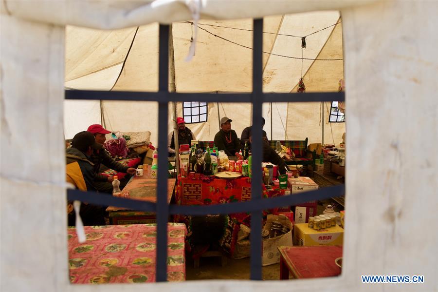Distribuidores chinos y nepaleses hacen negocios en un campamento fronterizo en el pueblo de Yagra del condado Zhongba, en Xigaze, en la región autónoma del Tíbet, suroeste de China, el 8 de septiembre de 2018. Existe una larga historia en el comercio entre residentes de ambos lados de la frontera China-Nepal. Cada a?o, el mercado fronterizo de Yagra, en Xigaze, está abierto en junio y septiembre, y dura unos diez días. (Xinhua / Purbu Zhaxi)