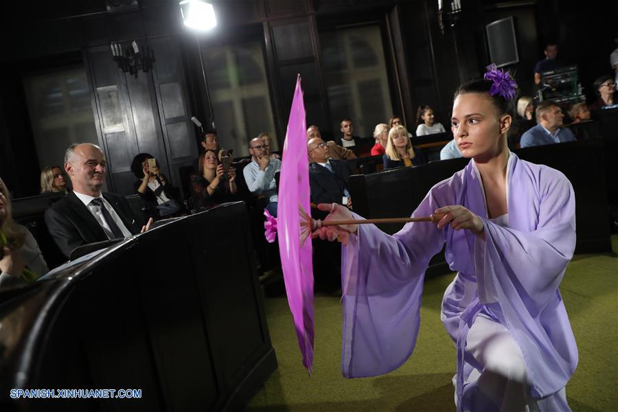 BANIA LUKA, septiembre 23, 2018 (Xinhua) -- Imagen del 22 de septiembre de 2018 de estudiantes del Instituto Confucio de la Universidad de Bania Luka interpretando un baile con vestimenta tradicional china, en Bania Luka, Bosnia y Herzegovina. El Instituto Confucio de la Universidad de Bania Luka organizó una serie de talleres interactivos en el marco del Día de los Institutos Confucio a través de un diverso programa de actividades en promoción de la cultura china el sábado. (Xinhua/Haris Memija)