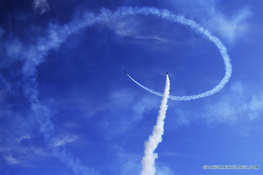 Aviones de aeromodelismo con motores de reacción realizan acrobacias en el aire durante un concurso llevado a cabo en Rongcheng, provincia de Shandong, en el este de China, el 13 de octubre de 2018. Un total de 12 equipos de todo el mundo compiten en el aire. (Xinhua/Lin Haizhen)