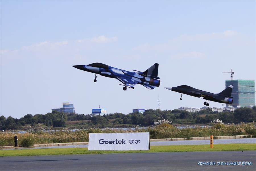 Dos avión de aeromodelismo con motores de reacción despegan durante un concurso llevado a cabo en Rongcheng, provincia de Shandong, en el este de China, el 13 de octubre de 2018. Un total de 12 equipos de todo el mundo compiten en el aire. (Xinhua/Wang Fudong)