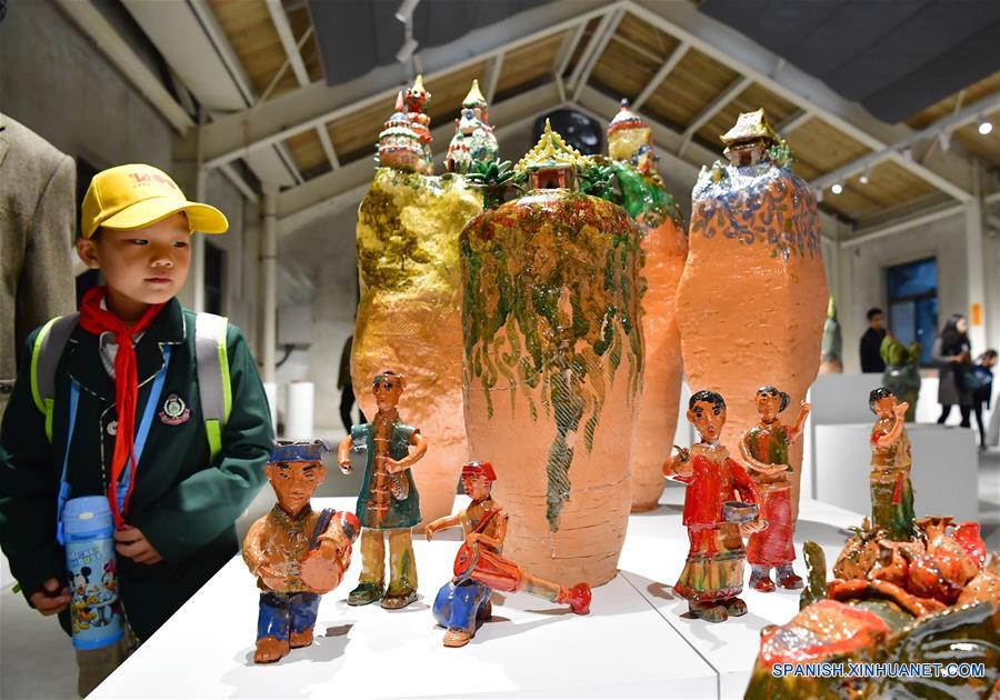 Imagen del 21 de octubre de 2018 de un ni?o observando obras de arte con cerámica en la ciudad de Tongchuan, provincia de Shaanxi, en el noroeste de China. Una serie de actividades fueron llevadas a cabo para conmemorar la cerámica kiln de Yaozhou, que tiene más de 1,400 a?os de historia. (Xinhua/Shao Rui)