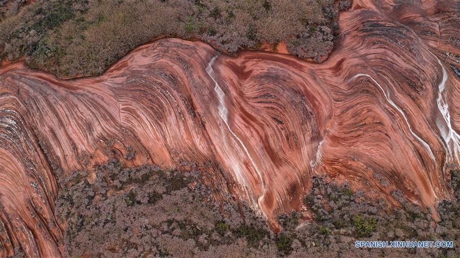 Imagen del 21 de octubre de 2018 de una vista aérea del relieve Danxia en Wangjiawan del municipio de Pingqiao, en el distrito Ansai de Yan'an, en la provincia de Shaanxi, en el noroeste de China. El relieve Danxia es un tipo único de geomorfología formada a partir de piedras areniscas rojizas y caracterizada por sus escarpados acantilados. (Xinhua/Tao Ming)