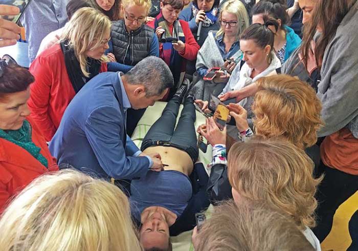Wang Tianjun, profesor de acupuntura, demuestra las técnicas a sus estudiantes en Londes, Inglaterra, Reino Unido. (Foto: proporcionada a China Daily)