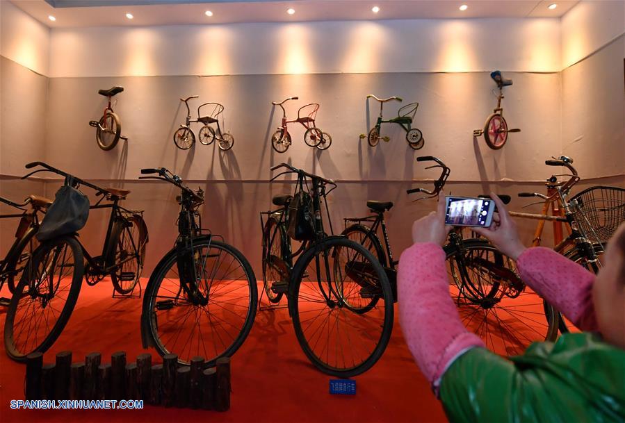 TAIYUAN, noviembre 14, 2018 (Xinhua) -- Una visitante toma fotografías de bicicletas en un museo especializado en vehículos antiguos en Taiyuan, capital de la provincia de Shanxi, en el norte de China, el 14 de noviembre de 2018. Cerca de 400 vehículos y bicicletas antiguas son exhibidas en el museo. (Xinhua/Cao Yang)