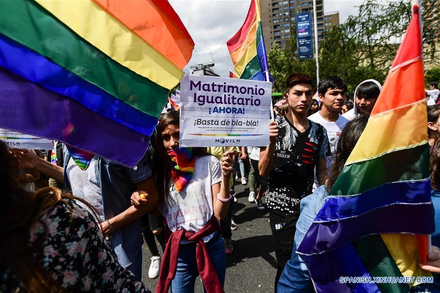 Personas participan durante la Marcha por la Igualdad Santiago Parade 2018, en Santiago, capital de Chile, el 17 de noviembre de 2018. La marcha fue organizada por el Movimiento de Integración y Liberación Homosexual (MOVILH) para exigir la aprobación de las leyes de matrimonio igualitario e identidad de género, de acuerdo con información de la prensa local. (Xinhua/Jorge Villegas)