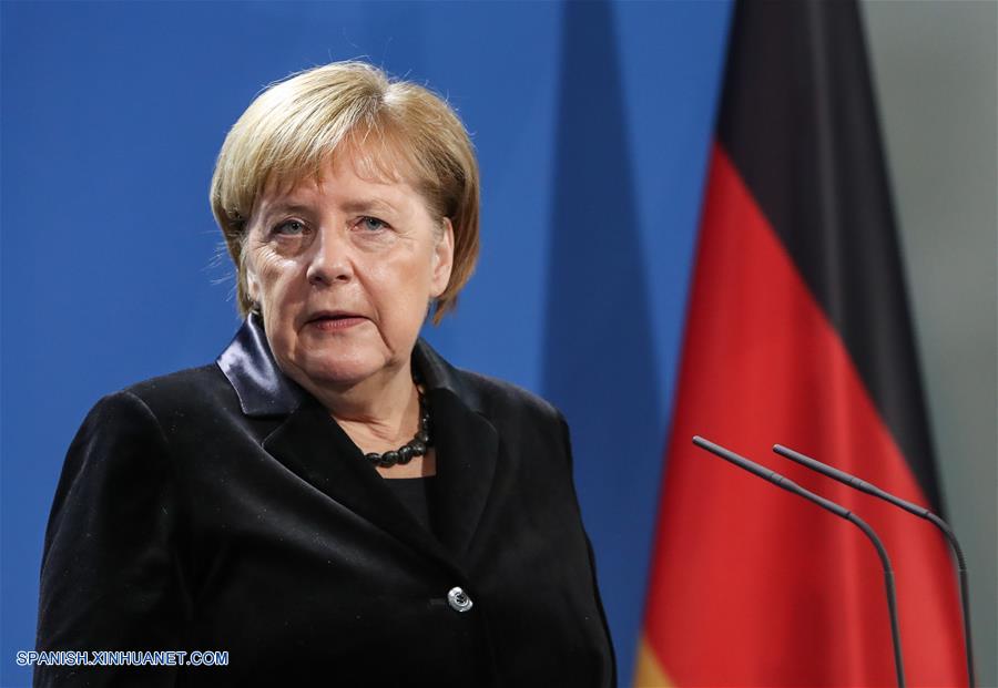 BERLIN, noviembre 18, 2018 (Xinhua) -- La canciller alemana, Angela Merkel, participa durante una conferencia de prensa conjunta con el presidente francés Emmanuel Macron, en la sede de la Cancillería alemana, en Berlín, capital de Alemania, el 18 de noviembre de 2018. El presidente de Francia, Emmanuel Macron, se dirigió el domingo a los legisladores alemanes y pidió la apertura de un nuevo capítulo para Europa y hacerla más integrada, más fuerte y más independiente. Macron visitó el domingo Berlín para asistir a una serie de eventos para conmemorar el Día de Duelo Nacional de Alemania, y se reunió con la canciller alemana, Angela Merkel. (Xinhua/Shan Yuqi)