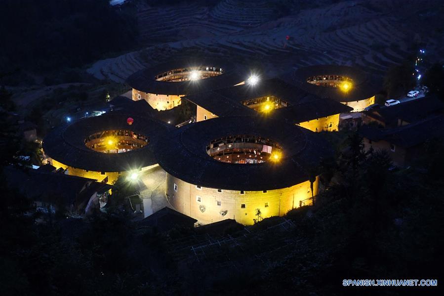Imagen del 23 de noviembre de 2018 de una vista de un complejo Tulou, en la ciudad de Zhangzhou, provincia de Fujian, en el sureste de China. El Fujian Tulou, que se remonta a las Dinastías Song y Yuan, es un tipo de vivienda rural china del pueblo Hakka de las zonas monta?osas de la provincia de Fujian. La distribución del Fujian Tulou siguió la tradición de vivienda china de concepto "cerrado exteriormente, abrierto interiormente": un muro de cerramiento con viviendas alrededor del periférico y un patio común en el centro. En 2008, el Tulou fue agregado a la Lista del Patrimonio Mundial como un sitio cultural. (Xinhua/Lin Shanchuan)