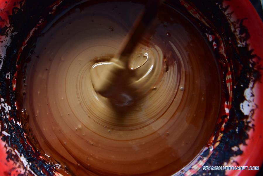 Un artesano remueve laca en la aldea de Maoba, en la ciudad de Lichuan, en la provincia de Hubei, en el centro China, el 24 de diciembre de 2018. Las artesanías de madera hechas de una laca producida localmente llamada "Ba" son populares en el mercado. (Xinhua/Yang Shunpi)
