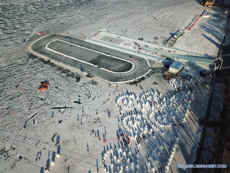 HEILONGJIANG, enero 2, 2019 (Xinhua) -- Vista aérea de personas observando esculturas de mu?ecos de nieve en la orilla del río Songhua, en Harbin, capital de la provincia de Heilongjiang, en el noreste de China, el 2 de enero de 2019. En total 2,019 mu?ecos de nieve fueron exhibidos en el lugar para recibir el a?o 2019. (Xinhua/Wang Jianwei)