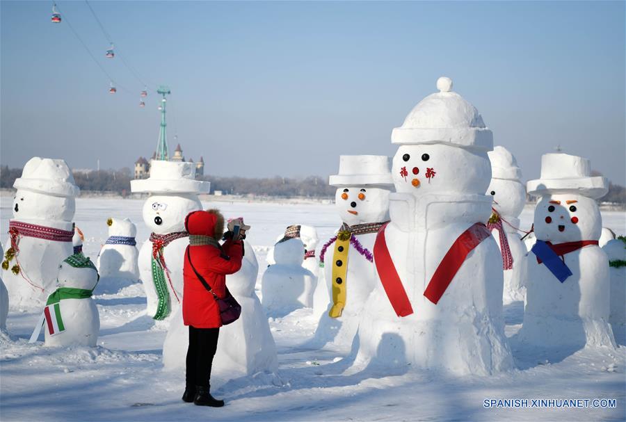 HEILONGJIANG, enero 2, 2019 (Xinhua) -- Una mujer toma fotografías de esculturas de mu?ecos de nieve en la orilla del río Songhua, en Harbin, capital de la provincia de Heilongjiang, en el noreste de China, el 2 de enero de 2019. En total 2,019 mu?ecos de nieve fueron exhibidos en el lugar para recibir el a?o 2019. (Xinhua/Wang Jianwei)