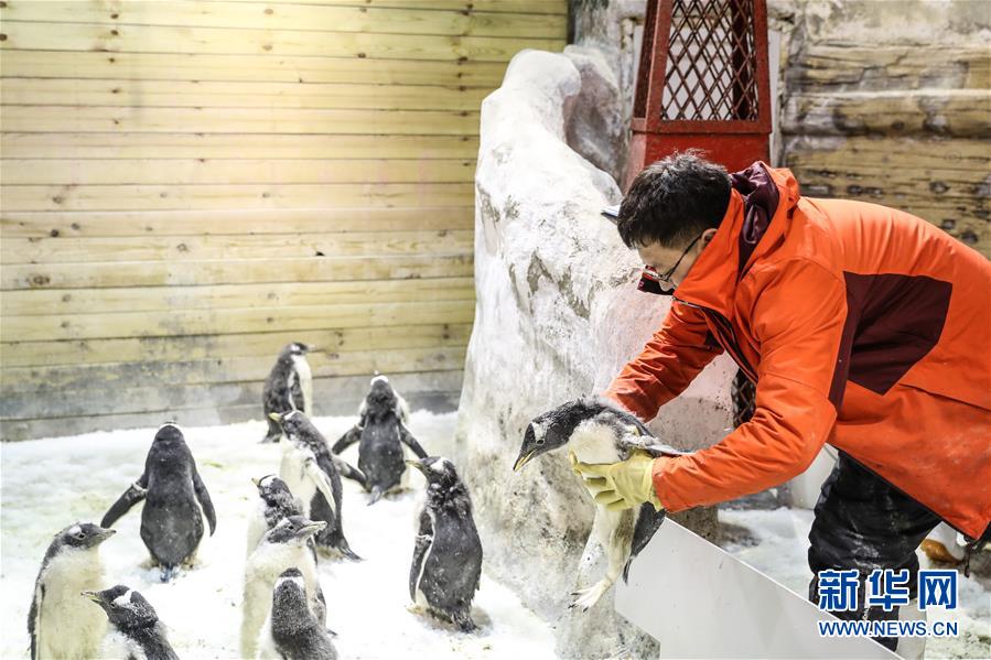 El 9 de enero, un cuidador alimenta a las crías de pingüinos de ceja blanca en el parque Ocean World de Dalian, que cuenta con una "guardería" especial que ayuda a las crías de pingüinos a aprender y crecer.
