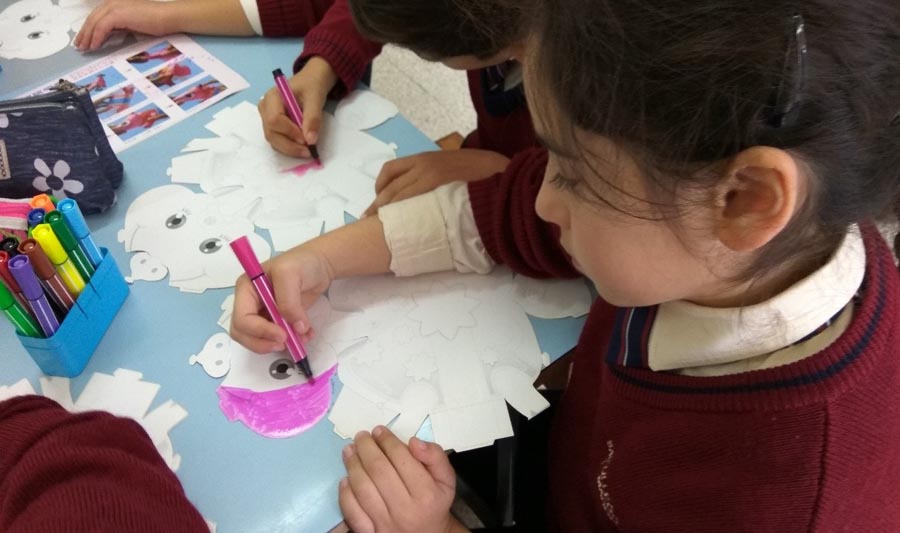 Estudiantes de primaria crean cerditos utilizando la técnica tradicional china del recortado en papel, Kalkara, Malta, 10 de enero del 2019. [Foto: Chinaculture. org]