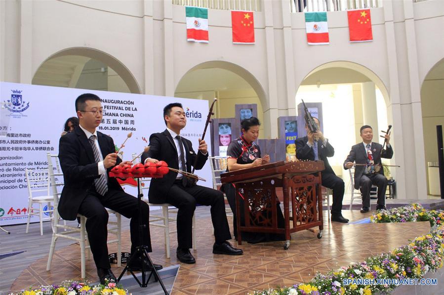 Imagen del 18 de enero de 2019 de un grupo de músicos chinos interpretando una melodía durante la ceremonia de inauguración de la "Semana China en Mérida", en Mérida, capital del estado de Yucatán, en México. Con la representación de las tradicionales danzas del Dragón y el León el viernes arrancó la "Semana China en Mérida" en la capital del estado mexicano de Yucatán, donde se localizan los vestigios de la milenaria civilización maya. (Xinhua/Luis Zetina)