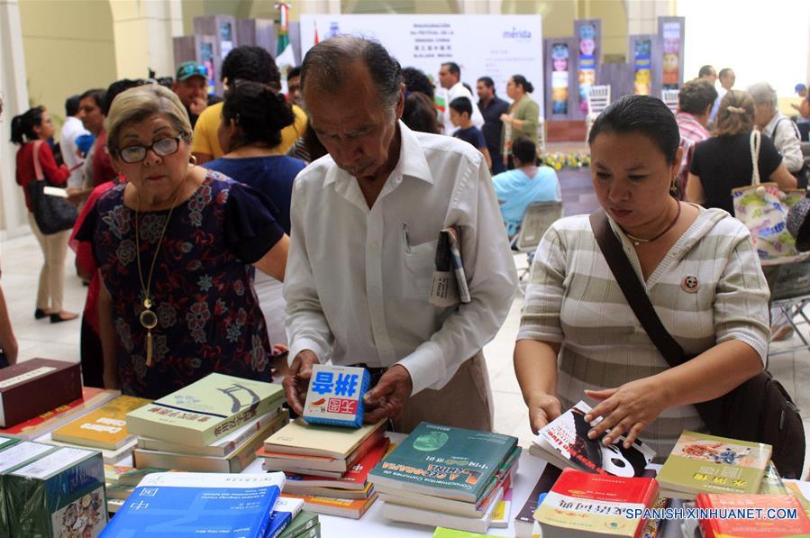 Imagen del 18 de enero de 2019 de personas observando libros después de la ceremonia de inauguración de la "Semana China en Mérida", en Mérida, capital del estado de Yucatán, en México. Con la representación de las tradicionales danzas del Dragón y el León el viernes arrancó la "Semana China en Mérida" en la capital del estado mexicano de Yucatán, donde se localizan los vestigios de la milenaria civilización maya. (Xinhua/Luis Zetina)