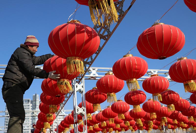 Un trabajador coloca faroles alegóricos al Festival de la Primavera en el parque del pueblo Boxing, en Binzhou, provincia de Shandong, 26 de enero del 2019. El Festival de la Primavera, o a?o nuevo chino, se celebrará el próximo 5 de febrero. [Foto: Xinhua]