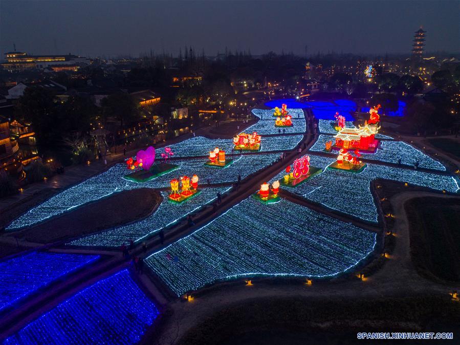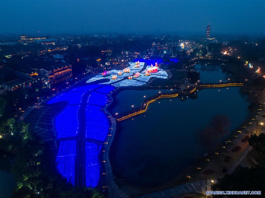 ZHEJIANG, enero 28, 2019 (Xinhua) -- Vista aérea de las linternas instaladas en Wuzhen, en la provincia de Zhejiang, en el este de China, el 28 de enero de 2019. Un festival de linternas local, que presentó más de 330 linternas, se llevó a cabo previo al próximo Festival de Primavera o A?o Nuevo Lunar chino, que se celebra el 5 de febrero este a?o. (Xinhua/Xu Yu)