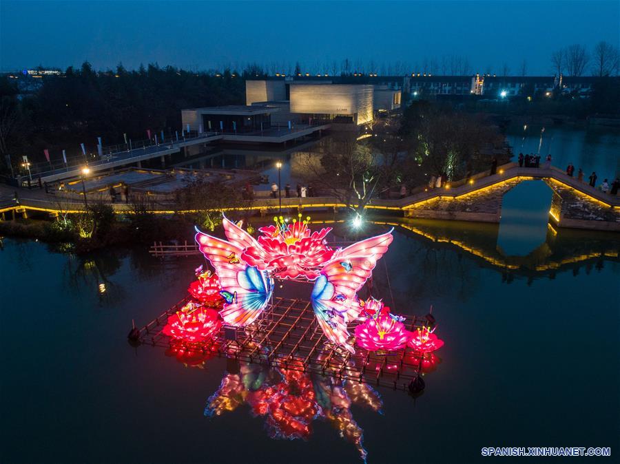 ZHEJIANG, enero 28, 2019 (Xinhua) -- Vista aérea de las linternas del dragón y el fénix instaladas en Wuzhen, en la provincia de Zhejiang, en el este de China, el 28 de enero de 2019. Un festival de linternas local, que presentó más de 330 linternas, se llevó a cabo previo al próximo Festival de Primavera o A?o Nuevo Lunar chino, que se celebra el 5 de febrero este a?o. (Xinhua/Xu Yu)