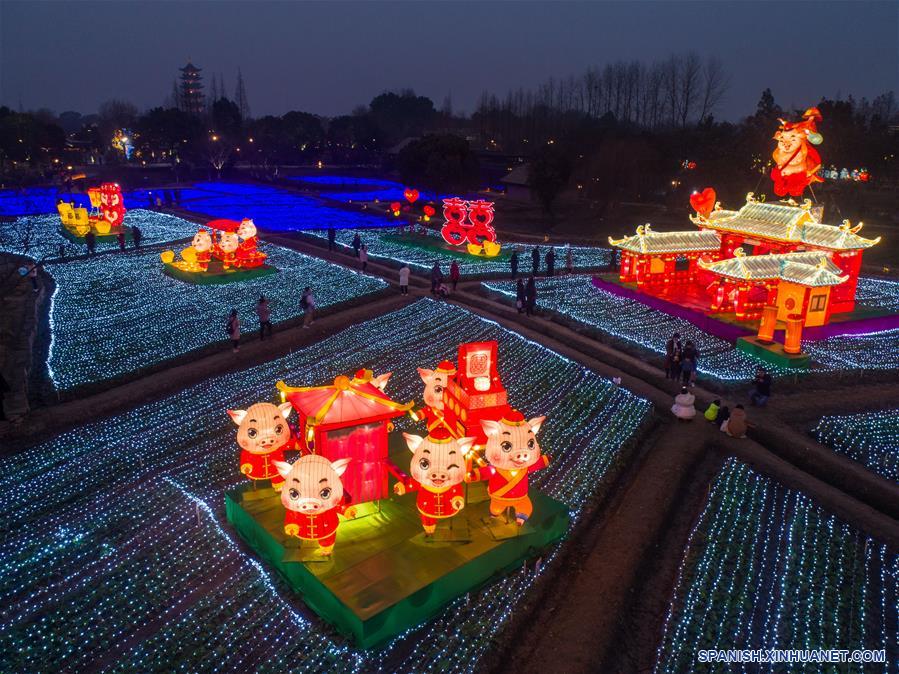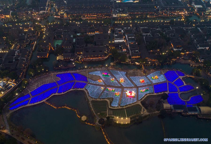 ZHEJIANG, enero 28, 2019 (Xinhua) -- Vista aérea de linternas temáticas de cerdos instaladas en Wuzhen, en la provincia de Zhejiang, en el este de China, el 28 de enero de 2019. Un festival de linternas local, que presentó más de 330 linternas, se llevó a cabo previo al próximo Festival de Primavera o A?o Nuevo Lunar chino, que se celebra el 5 de febrero este a?o. (Xinhua/Xu Yu)