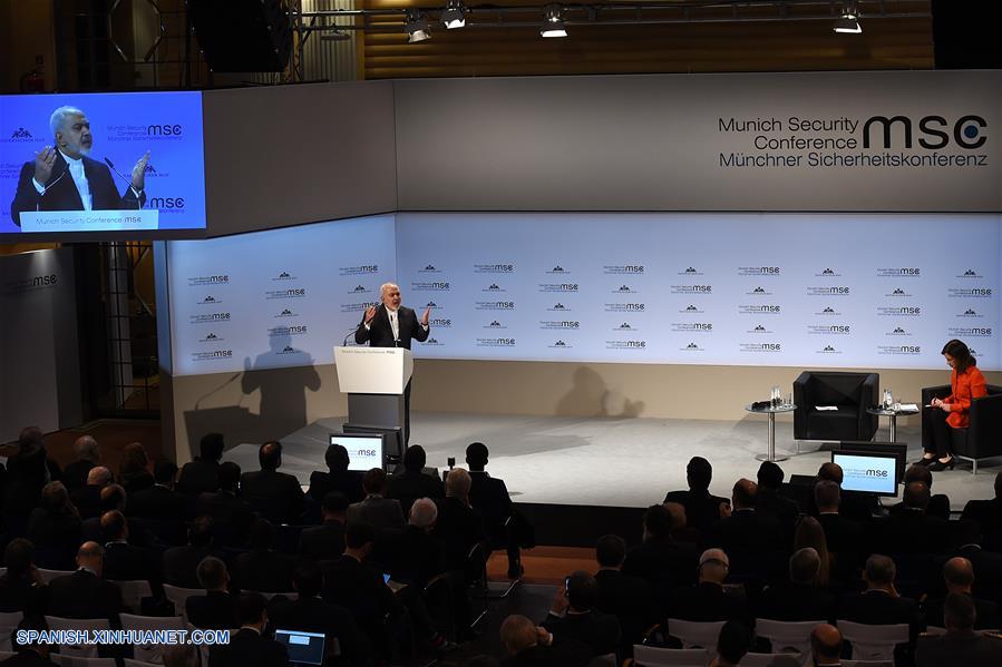 MUNICH, febrero 17, 2019 (Xinhua) -- El ministro de Asuntos Exteriores iraní, Mohammad Javad Zarif (i), pronuncia un discurso durante la 55 Conferencia de Seguridad de Múnich (CSM), en Múnich, Alemania, el 17 de febrero de 2019. Mohammad Javad Zarif instó el domingo a las potencias europeas a hacer más para salvar el acuerdo nuclear con la república islámica y acusó a Washington de tener "una obsesión" con Irán. (Xinhua/Lu Yang)