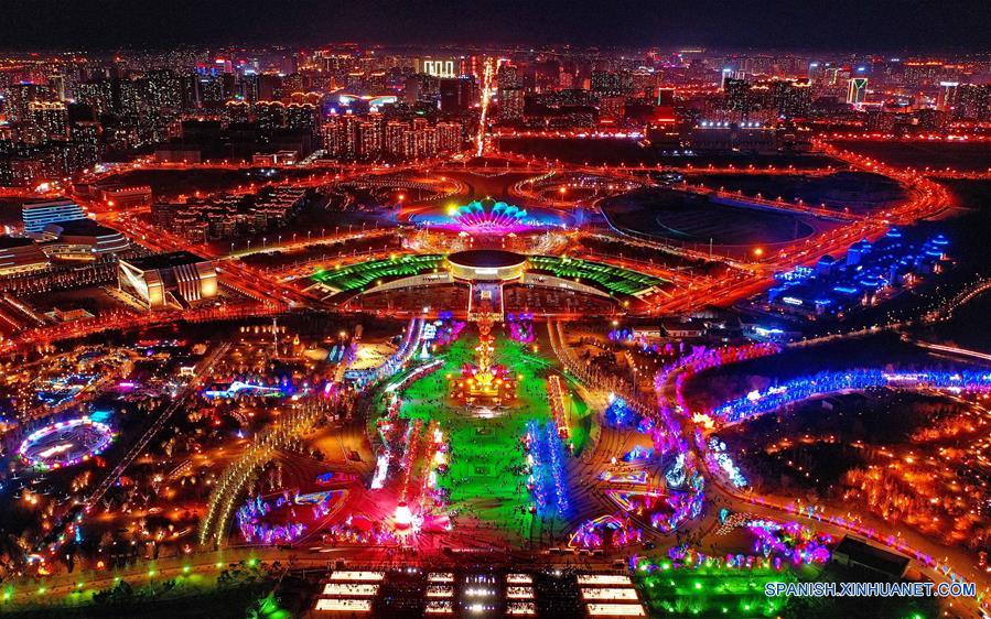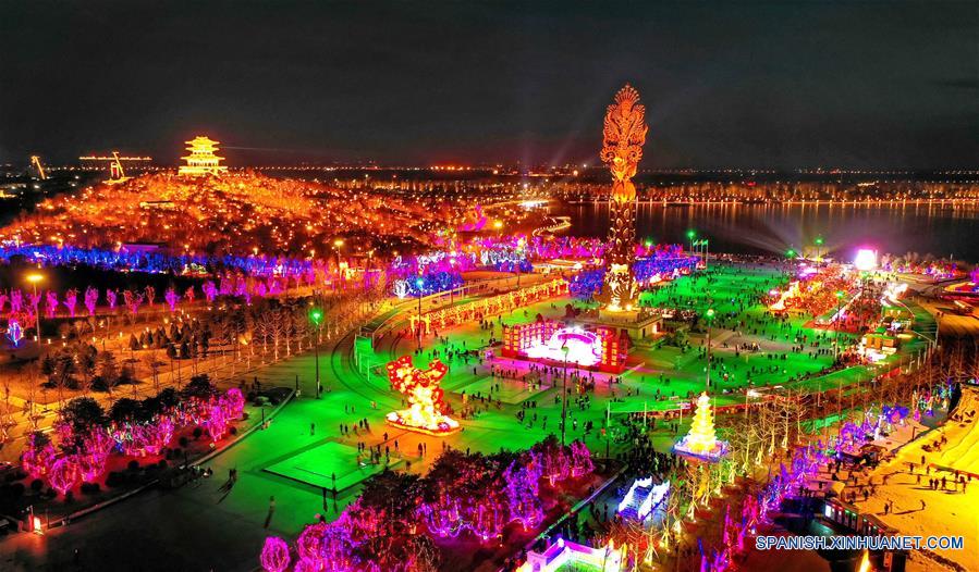 HEBEI, febrero 18, 2019 (Xinhua) -- Imagen del 17 de febrero de 2019 de una vista aérea del paisaje nocturno del Parque Nanhu, donde se lleva a cabo una Feria de Faroles para celebrar el próximo Festival de los Faroles, que se conmemora el 19 de febrero de este a?o, en la ciudad de Tangshan, en la provincia de Hebei, en el norte de China. (Xinhua/Yang Shiyao)