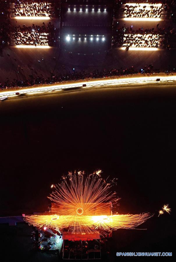 HEBEI, febrero 18, 2019 (Xinhua) -- Imagen del 17 de febrero de 2019 de una vista aérea de artistas rociando hierro fundido para crear fuegos artificiales en el Parque Nanhu, donde se lleva a cabo una Feria de Faroles para celebrar el próximo Festival de los Faroles, que se conmemora el 19 de febrero de este a?o, en la ciudad de Tangshan, en la provincia de Hebei, en el norte de China. (Xinhua/Yang Shiyao)