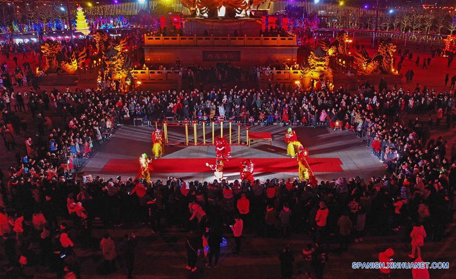 HEBEI, febrero 18, 2019 (Xinhua) -- Imagen del 17 de febrero de 2019 de una vista aérea de personas observando una danza del león en el Parque Nanhu, donde se lleva a cabo una Feria de Faroles para celebrar el próximo Festival de los Faroles, que se conmemora el 19 de febrero de este a?o, en la ciudad de Tangshan, en la provincia de Hebei, en el norte de China. (Xinhua/Yang Shiyao)