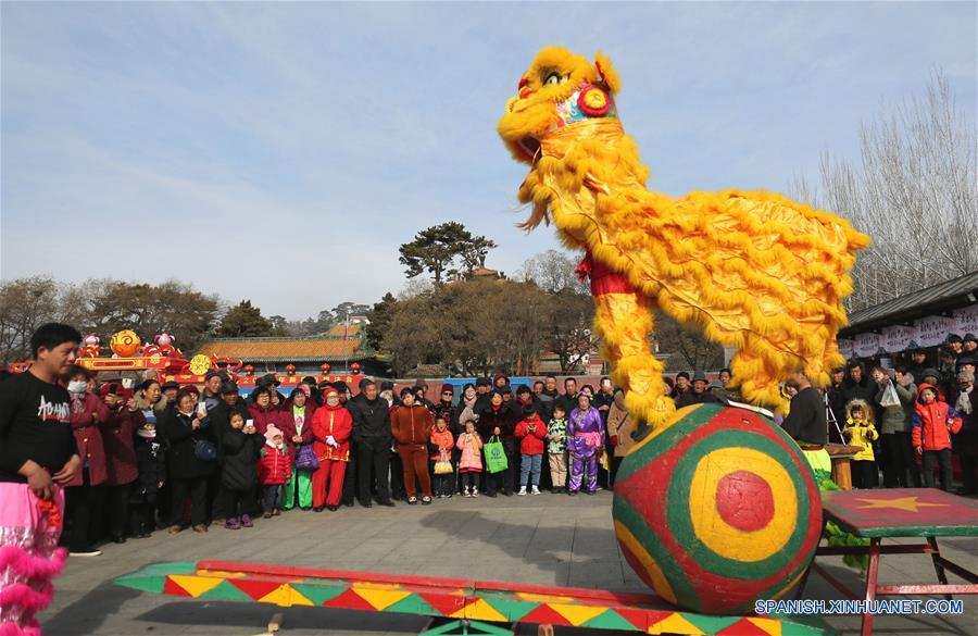 HEBEI, febrero 18, 2019 (Xinhua) -- Artistas folclóricos interpretan la danza del león en el Resort Imperial de Verano en Chengde, en la provincia de Hebei, en el norte de China, el 18 de febrero de 2019. Muchos lugares en el país han sido decorados con linternas para celebrar el próximo Festival de la Linterna, que se conmemora el 19 de febrero de este a?o. (Xinhua/Liu Huanyu)