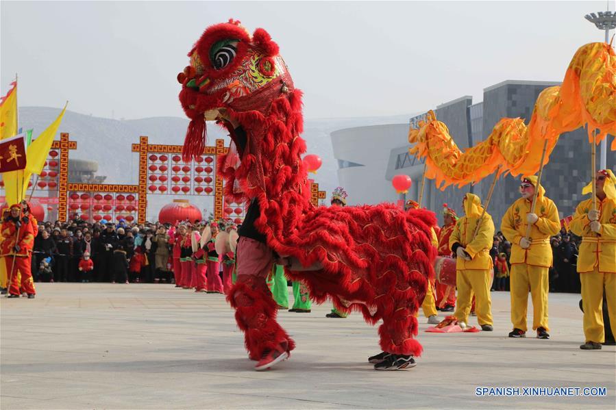 GANSU, febrero 18, 2019 (Xinhua) -- Un equipo shehuo realiza una danza del león en un parque en el distrito Anding de la ciudad de Dingxi, en la provincia de Gansu, en el noroeste de China, el 18 de febrero de 2019. Muchos lugares en el país han sido decorados con linternas para celebrar el próximo Festival de los Faroles, que se conmemora el 19 de febrero de este a?o. (Xinhua/Wang Kexian)