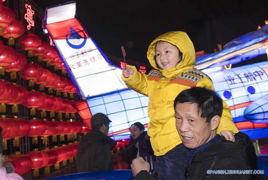 SHANDONG, febrero 18, 2019 (Xinhua) -- Visitantes observan linternas durante un espectáculo en Zibo, en la provincia de Shandong, en el este de China, el 18 de febrero de 2019. Muchos lugares en el país han sido decorados con linternas para celebrar el próximo Festival de los Faroles, que se conmemora el 19 de febrero de este a?o. (Xinhua/Yuan Deliang)