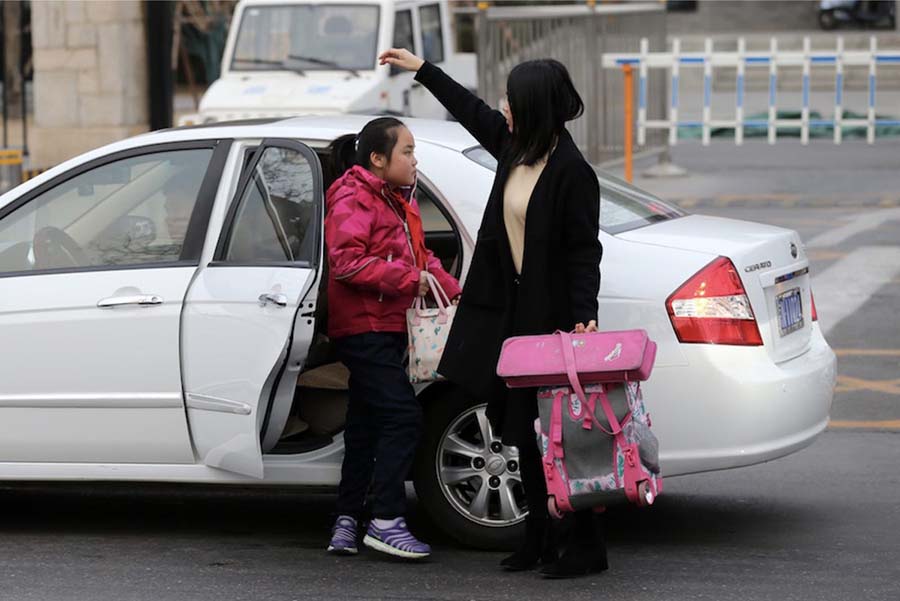 Una madre lleva la mochila a su hija mientras que se baja del coche para ir a la Escuela Primaria Experimental Huajadi en Beijing el 25 de febrero de 2019. [Foto por Wang Zhuangfei / chinadaily.com.cn]
