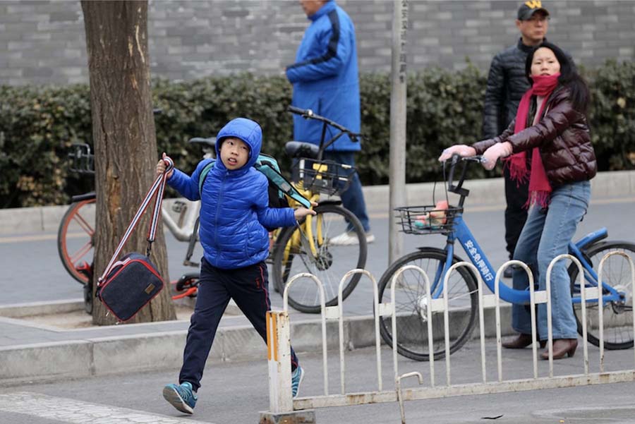 Un ni?o se cuelga la mochila antes de llegar a la Escuela Primaria Experimental Huajadi en Beijing el 25 de febrero de 2019. [Foto por Wang Zhuangfei / chinadaily.com.cn]