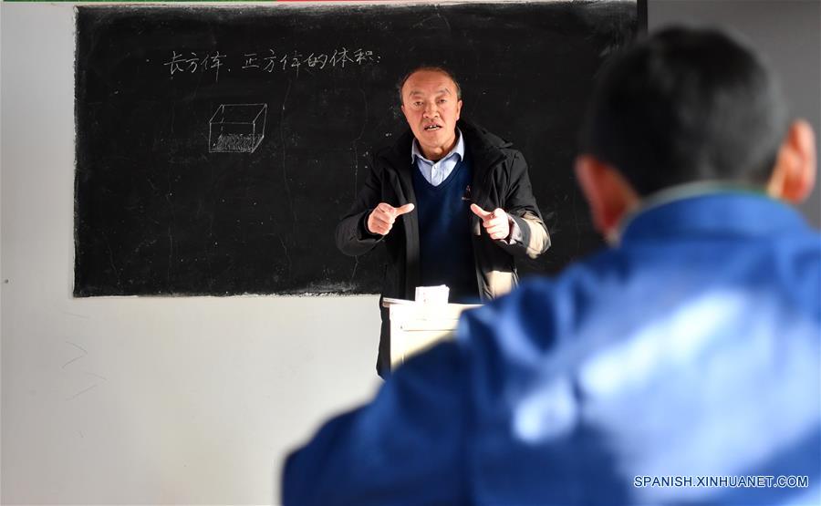 Imagen del 28 de febrero de 2019 del profesor Kong Wenqing dando una clase en la villa Huashan, en el condado de Yiyang, en la provincia de Henan, en el centro de China. En a?os recientes, mientras los residentes se han mudado gradualmente fuera del área monta?osa, solo quedan un profesor y tres estudiantes en la villa Huashan para el nuevo semestre de 2019. Kong Wenqing, quien se ha comprometido con la carrera de la ense?anza por 36 a?os, esta a cargo de casi todos los asuntos incluyendo administración, contabilidad, cocina y limpieza de la escuela. El profesor abandonó la oportunidad de ser director en otra escuela en el a?o 2006 y escogió continuar ense?ando en la villa Huashan porque cree que los estudiantes aquí lo necesitan más. A pesar de sólo queda un peque?o número de estudiantes, Kong Wenqing no escatima en esfuerzos para darles tutoría. Ha alcanzado la edad de retiro, pero pretende ser recontratado y continuar ense?ando mientras aún haya ni?os en edad escolar. (Xinhua/Li Jianan)