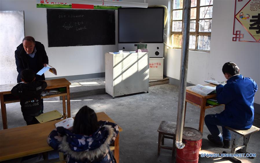 HENAN, marzo 1, 2019 (Xinhua) -- Imagen del 28 de febrero de 2019 del profesor Kong Wenqing dando su clase en la villa Huashan, en el condado de Yiyang, en la provincia de Henan, en el centro de China. En a?os recientes, mientras los residentes se han mudado gradualmente fuera del área monta?osa, solo quedan un profesor y tres estudiantes en la villa Huashan para el nuevo semestre de 2019. Kong Wenqing, quien se ha comprometido con la carrera de la ense?anza por 36 a?os, está a cargo de casi todos los asuntos incluyendo administración, contabilidad, cocina y limpieza de la escuela. El profesor abandonó la oportunidad de ser director en otra escuela en el a?o 2006 y escogió continuar ense?ando en la villa Huashan porque cree que los estudiantes aquí lo necesitan más. A pesar de sólo queda un peque?o número de estudiantes, Kong Wenqing no escatima en esfuerzos para darles tutoría. Ha alcanzado la edad de retiro, pero pretende ser recontratado y continuar ense?ando mientras aún haya ni?os en edad escolar. (Xinhua/Li Jianan)
