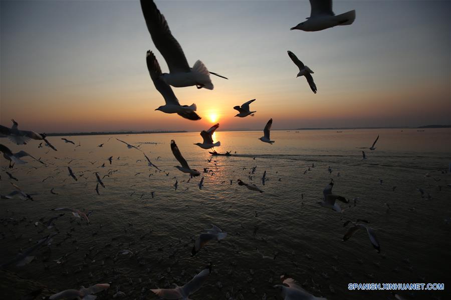 Gaviotas vuelan sobre la orilla del río Thanlwin durante la puesta de sol, en el municipio de Mawlamyine, estado de Mon, Myanmar, el 1 de marzo de 2019. (Xinhua/U Aung)