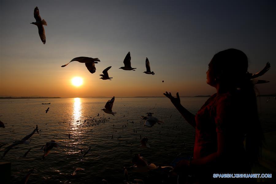 Una mujer alimenta a las gaviotas en la orilla del río Thanlwin durante la puesta de sol, en el municipio de Mawlamyine, estado de Mon, Myanmar, el 1 de marzo de 2019. (Xinhua/U Aung)