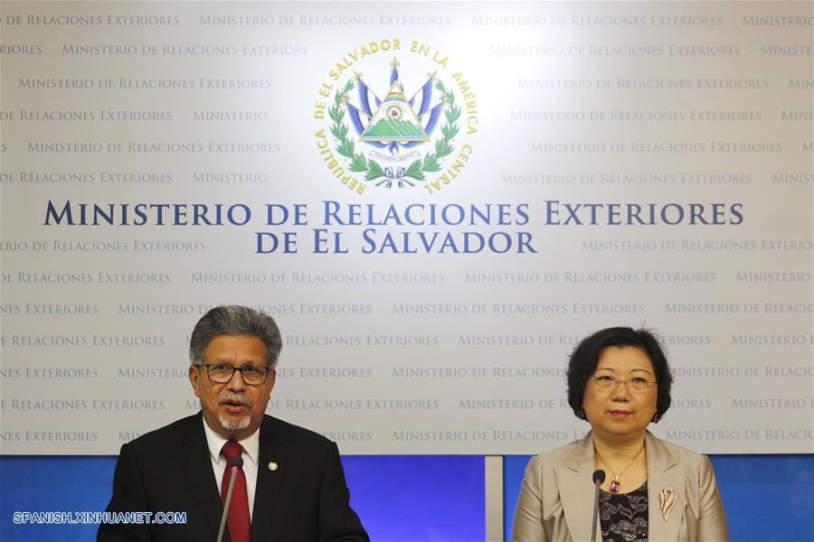 SAN SALVADOR, 13 marzo, 2019 (Xinhua) -- Imagen del 12 de marzo de 2019 de la embajadora de China en El Salvador, Ou Jianhong (d), y el canciller de El Salvador, Carlos Castaneda (i), participando en una conferencia de prensa, en San Salvador, El Salvador. El canciller de El Salvador, Carlos Castaneda, y la embajadora de China en ese país, Ou Jianhong, dieron a conocer los avances en los programas de cooperación bilateral. (Xinhua/Alexander Pe?a)