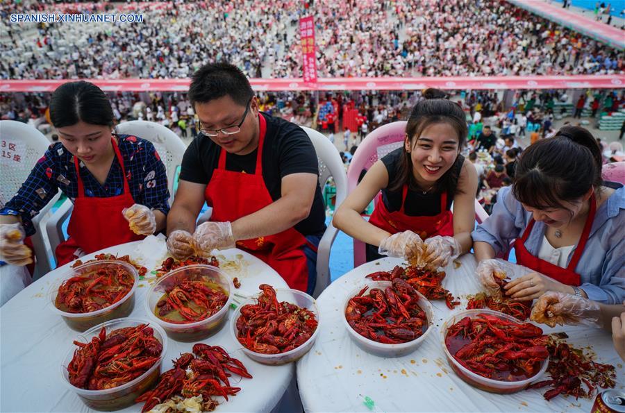 JIANGSU, 18 marzo, 2019 (Xinhua) -- Imagen del 13 de junio de 2018 de visitantes probando cangrejos de río en un banquete masivo, en Xuyi, en la provincia de Jiangsu, en el este de China. El sector de la restauración de China registró unos ingresos récord de 4,27 billones de yuanes (636.000 millones de dólares) en 2018, dijo el domingo la Asociación de Cocina de China. Este volumen representó el 11,2 por ciento del total de las ventas minoristas del a?o pasado y fue un 0,4 por ciento superior al de 2017, dijo Jiang Junxian, presidente de la asociación. El sector también aportó un 20,9 por ciento al crecimiento del consumo en 2018, indicó. (Xinhua/Li Xiang)