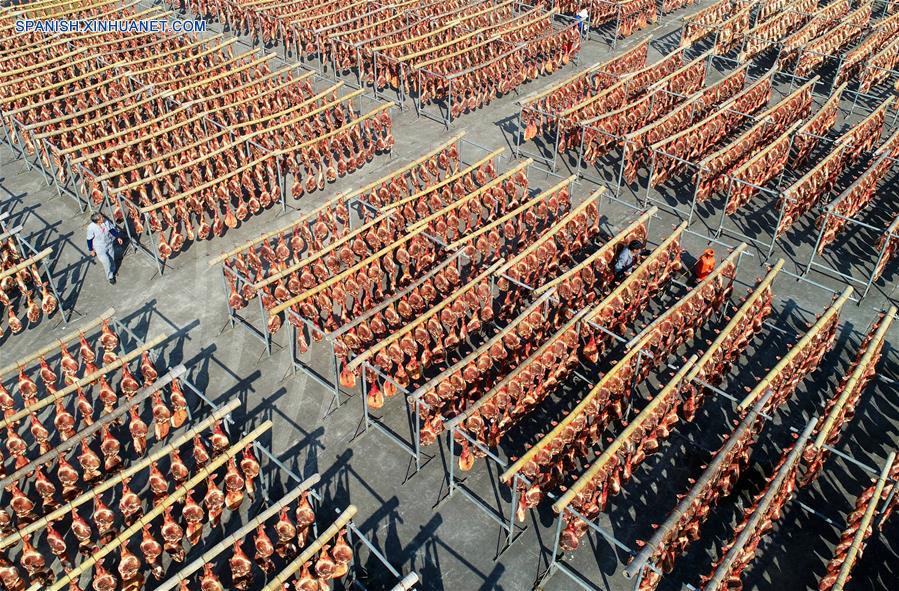 ZHEJIANG, 18 marzo, 2019 (Xinhua) -- Imagen del 1 de diciembre de 2018 de empleados secando jamones en el poblado de Nanma, de la ciudad de Jinhua, en la provincia de Zhejiang, en el este de China. El sector de la restauración de China registró unos ingresos récord de 4,27 billones de yuanes (636.000 millones de dólares) en 2018, dijo el domingo la Asociación de Cocina de China. Este volumen representó el 11,2 por ciento del total de las ventas minoristas del a?o pasado y fue un 0,4 por ciento superior al de 2017, dijo Jiang Junxian, presidente de la asociación. El sector también aportó un 20,9 por ciento al crecimiento del consumo en 2018, indicó. (Xinhua/Bao Kangxuan)