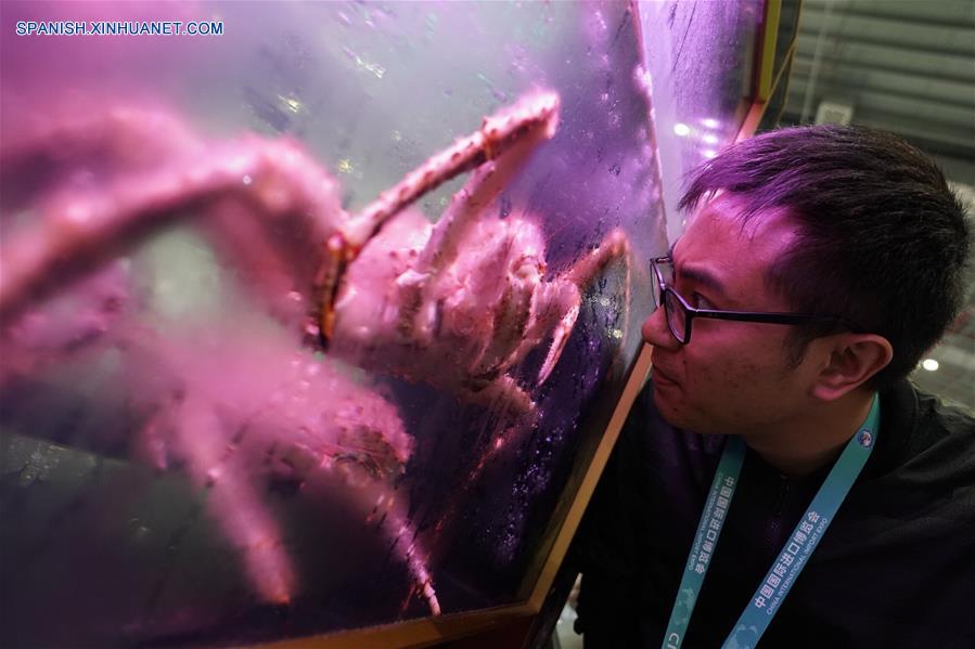 SHANGHAI, 18 marzo, 2019 (Xinhua) -- Imagen del 7 de noviembre de 2018 de un visitante observando cangrejos de Rusia en el área de Productos Agrícolas y Alimenticios durante la primera Exposición Internacional de Importaciones de China (CIIE, por sus siglas en inglés), en Shanghai, en el este de China. El sector de la restauración de China registró unos ingresos récord de 4,27 billones de yuanes (636.000 millones de dólares) en 2018, dijo el domingo la Asociación de Cocina de China. Este volumen representó el 11,2 por ciento del total de las ventas minoristas del a?o pasado y fue un 0,4 por ciento superior al de 2017, dijo Jiang Junxian, presidente de la asociación. El sector también aportó un 20,9 por ciento al crecimiento del consumo en 2018, indicó. (Xinhua/Shen Bohan)