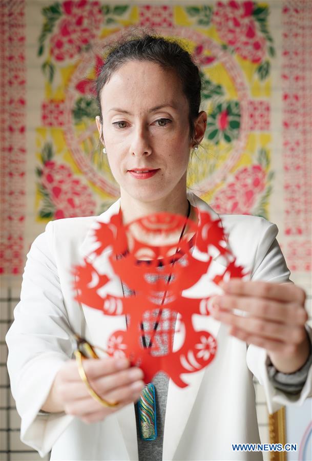 Berenice Zandonai, de nacionalidad francesa, presenta una pieza de papel recortado en su casa de Xi'an, capital de la provincia de Shaanxi, 19 de octubre del 2018. (Foto: Shao Rui/ Xinhua)