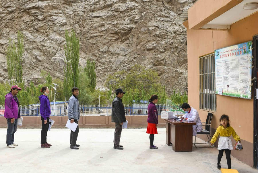 Residentes hacen fila pare recibir los resultados del chequeo médico en la clínica de la aldea Yaragzi del poblado de Xihxu del distrito de Yecheng, en la región autónoma uygur de Xinjiang, en el noroeste de China, el 2 de mayo de 2020. (Xinhua/Hu Huhu)